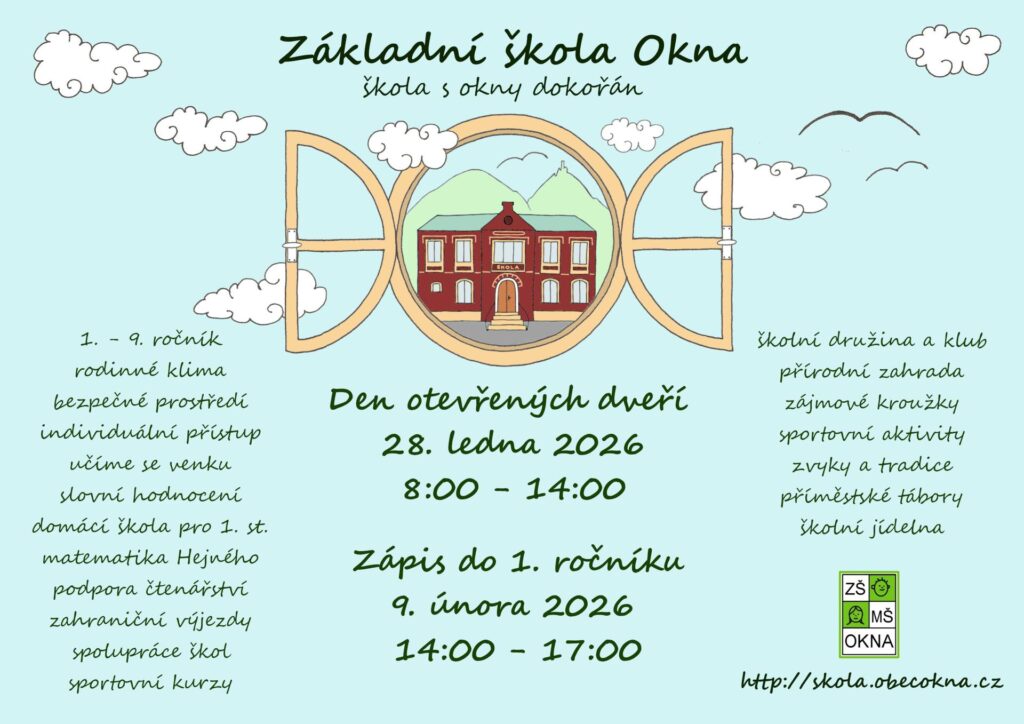 Základní a mateřská škola Okna je místem, kde se snažíme, aby se děti cítily bezpečně, přijímané a respektované. Jsme malá škola s rodinnou atmosférou, která je přirozenou součástí obce Okna a jejího života. Známe se navzájem jménem, potkáváme se i mimo školní budovu a budujeme vztahy, které dávají vzdělávání skutečný smysl.