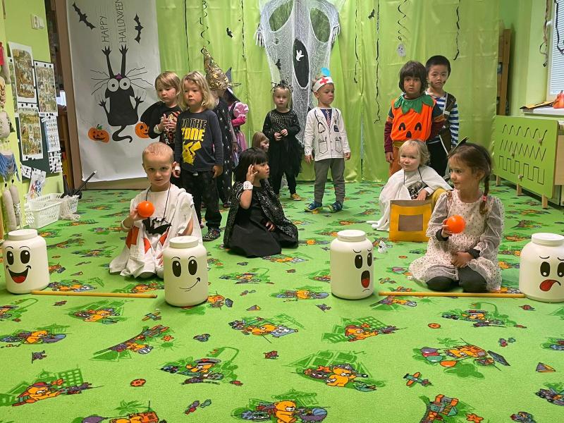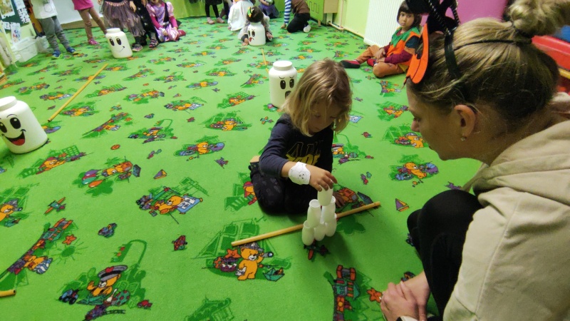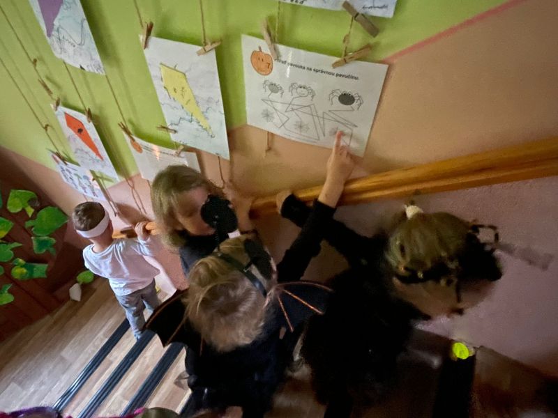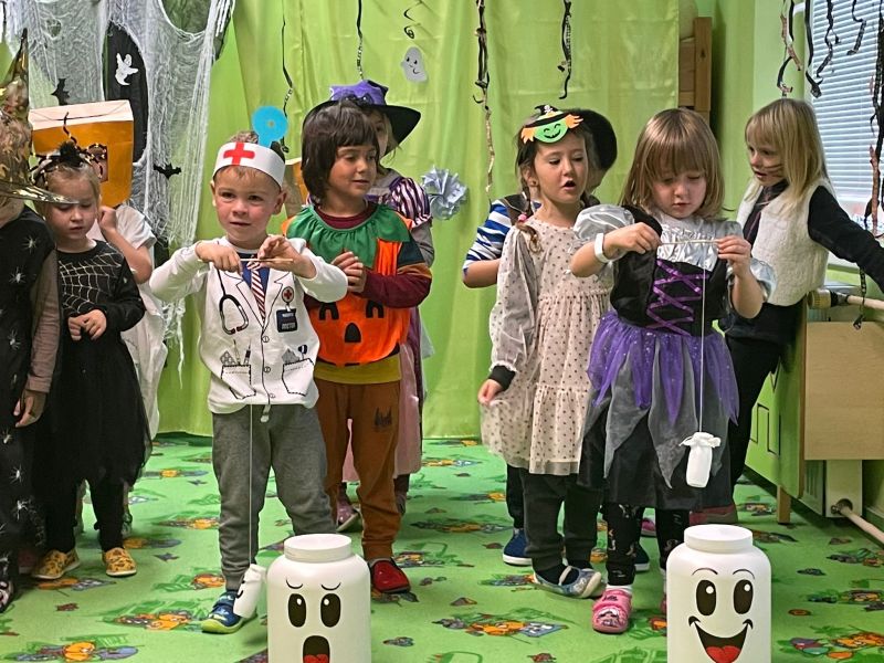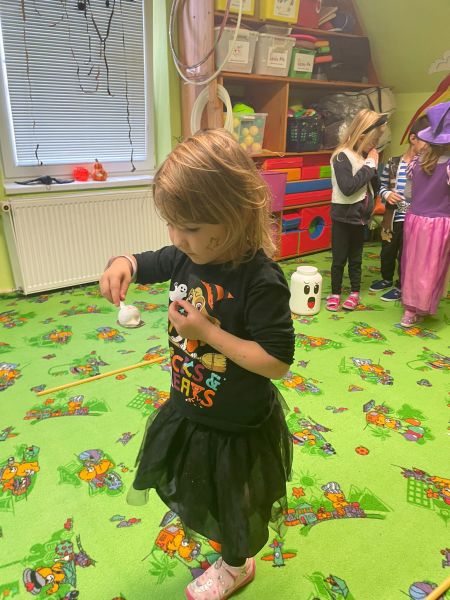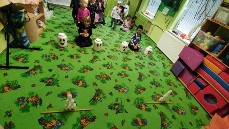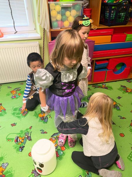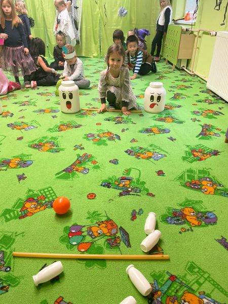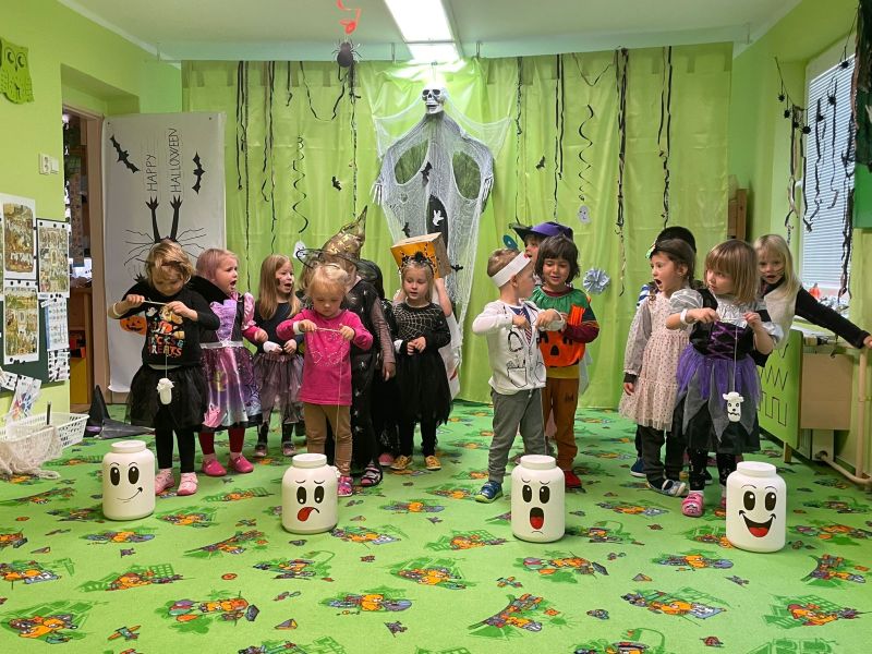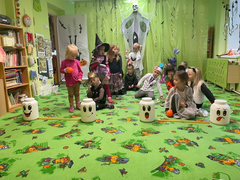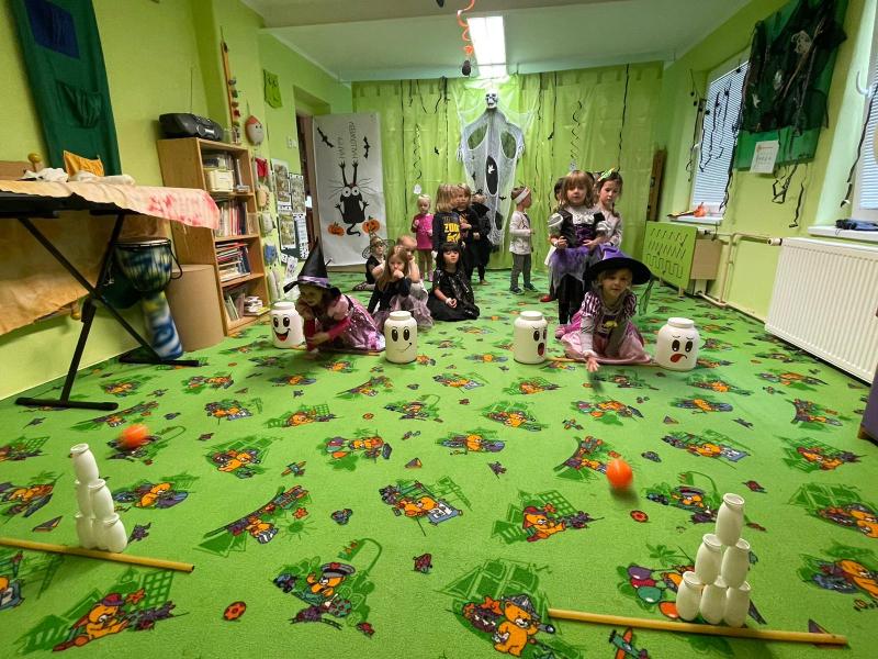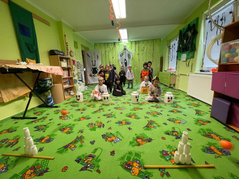 Happy Halloween! Děti převlečené v kostýmech se účastnily různých aktivit a her v daném duchu. Duchové nás provázeli v průběhu celého dopoledne – hod na cíl a horním obloukem, pyramidy z duchů, namotávání, chytání duchů apod. Také si děti zkusily rovnovážné cvičení, orientaci v prostoru, spolupráci ve skupině, převzetí různých rolí, dokončit činnost aj. Překonávaly své obavy a nejistoty z něčeho nového. Vše zvládly skvěle a s velikou chutí. Nadšeně předávaly nové zkušenosti a zážitky z aktivit svým rodičům. Za zvládnuté aktivity a kostýmy je čekalo ocenění a něco na zoubek :). Již se těší na slavení Památky zesnulých a návštěvu místního hřbitova, kde budeme čistit opuštěné hroby, zdobit je a zapalovat svíce.