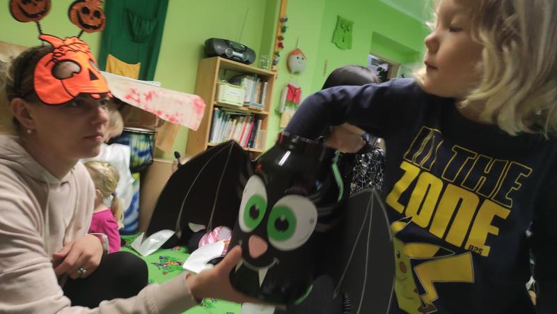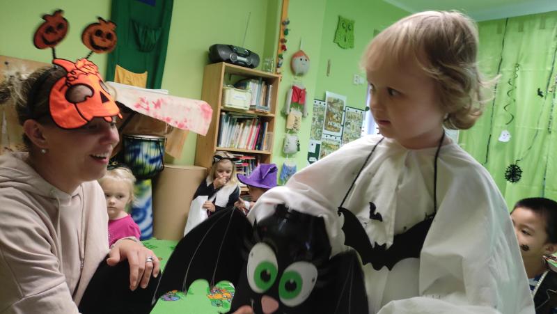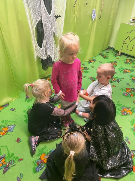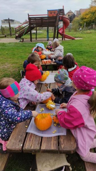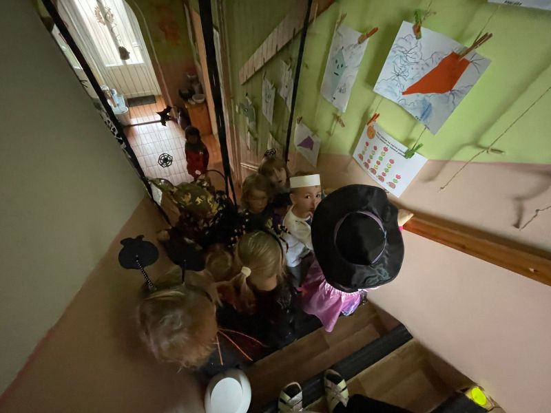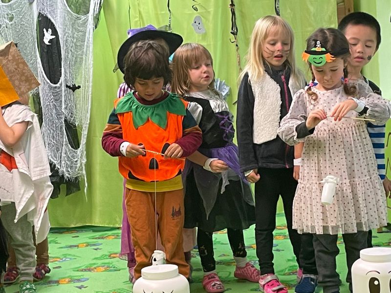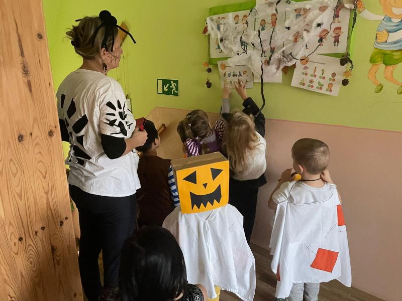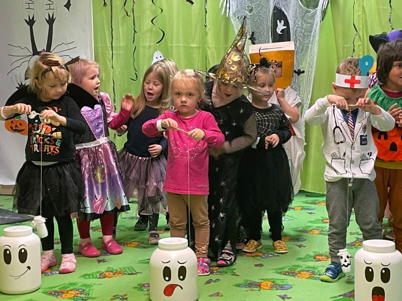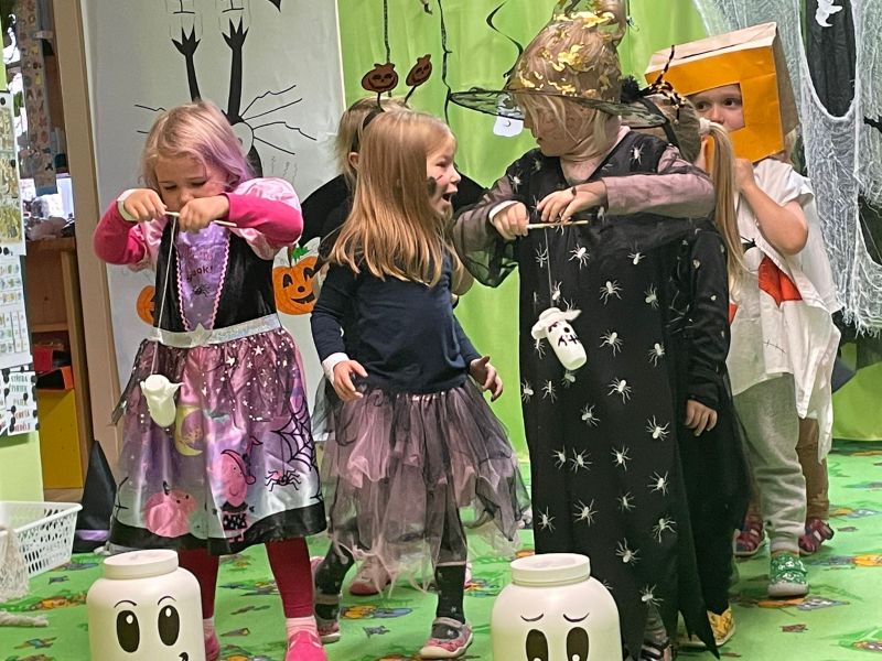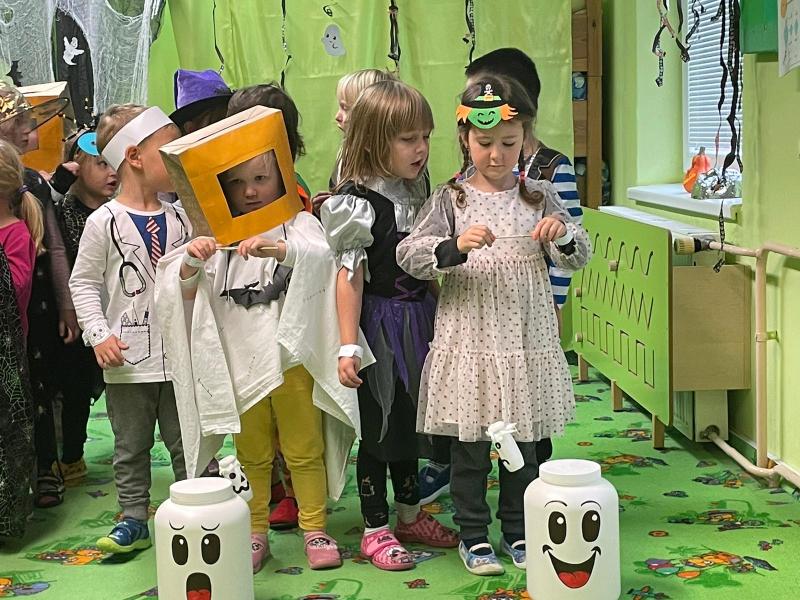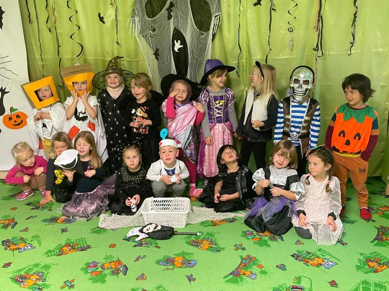 Happy Halloween! Děti převlečené v kostýmech se účastnily různých aktivit a her v daném duchu. Duchové nás provázeli v průběhu celého dopoledne – hod na cíl a horním obloukem, pyramidy z duchů, namotávání, chytání duchů apod. Také si děti zkusily rovnovážné cvičení, orientaci v prostoru, spolupráci ve skupině, převzetí různých rolí, dokončit činnost aj. Překonávaly své obavy a nejistoty z něčeho nového. Vše zvládly skvěle a s velikou chutí. Nadšeně předávaly nové zkušenosti a zážitky z aktivit svým rodičům. Za zvládnuté aktivity a kostýmy je čekalo ocenění a něco na zoubek :). Již se těší na slavení Památky zesnulých a návštěvu místního hřbitova, kde budeme čistit opuštěné hroby, zdobit je a zapalovat svíce.