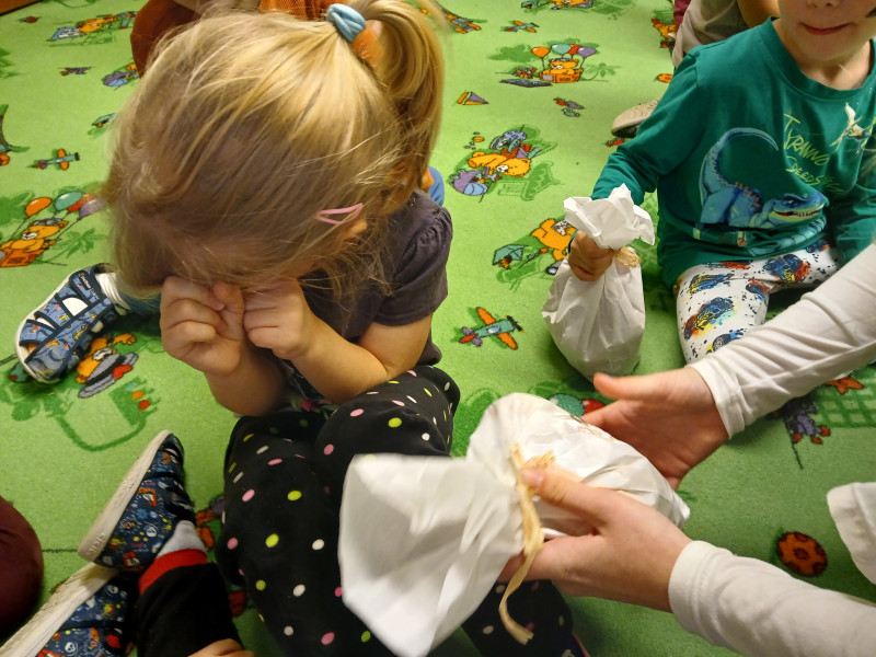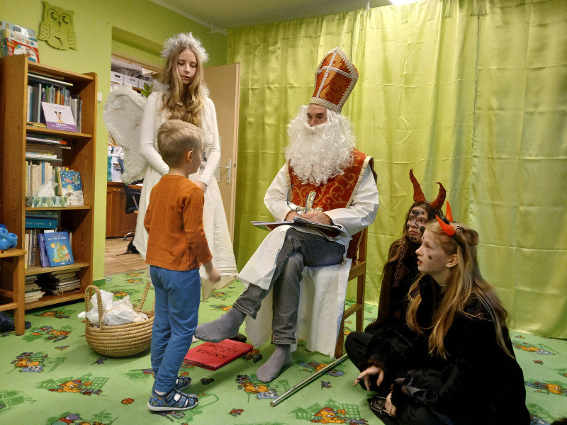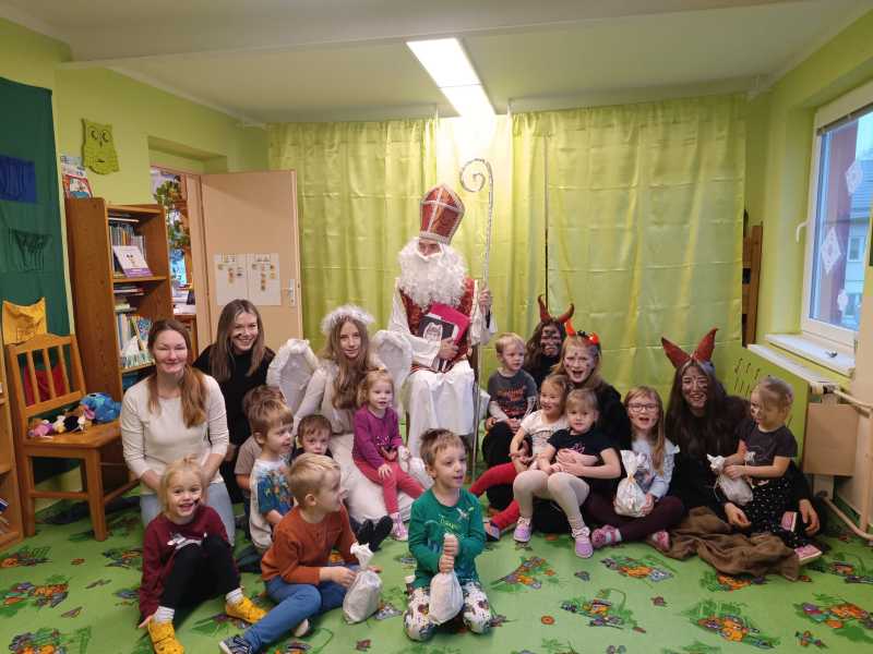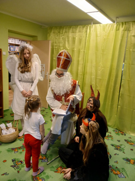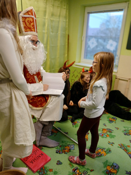 V pátek 5.prosince zavítal tradičně k nám do školky Mikuláš se svou družinou. Děti zazpívaly skupinově píseň „Mik, Mik, Mikuláše“ a odvážlivec Staník zarecitoval dobrovolně i básničku. Děti byly pochváleny za dobré skutky a zároveň jim byly sděleny výtky k nápravě. Nikdo však v pytli nakonec neskončil a čertice tak znovu odcházely s prázdnou. Děti si odnesly domů balíček s mlsnotami a také trochou uhlí.