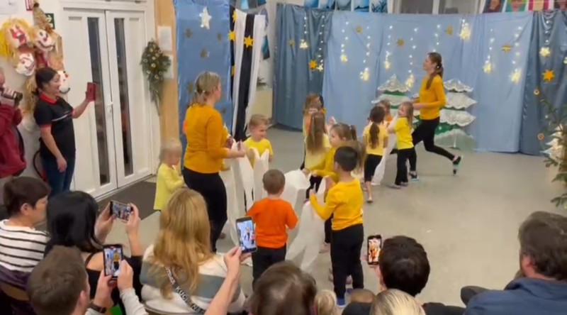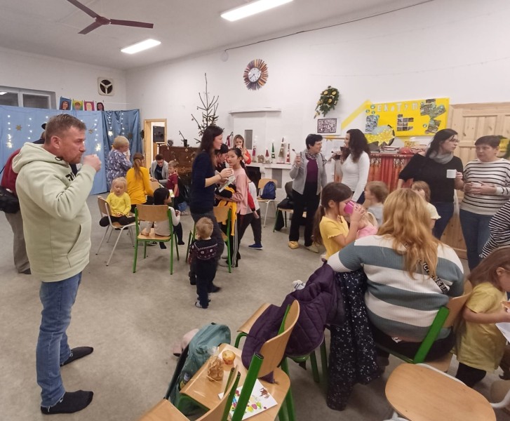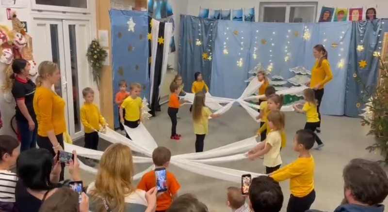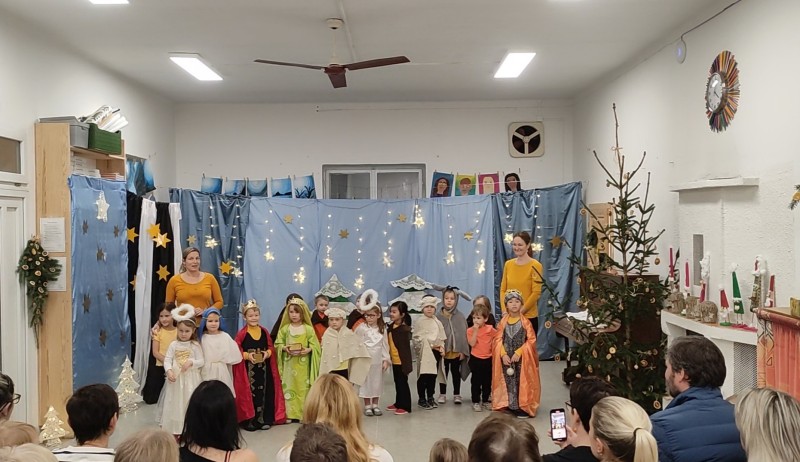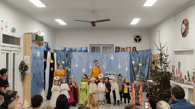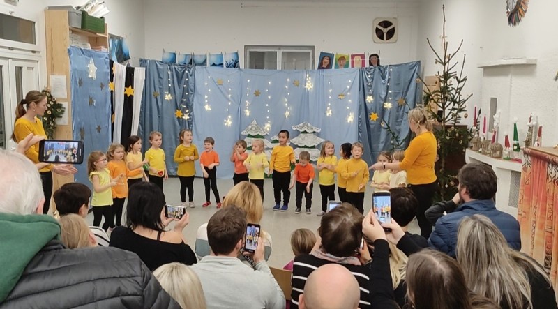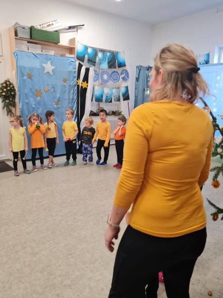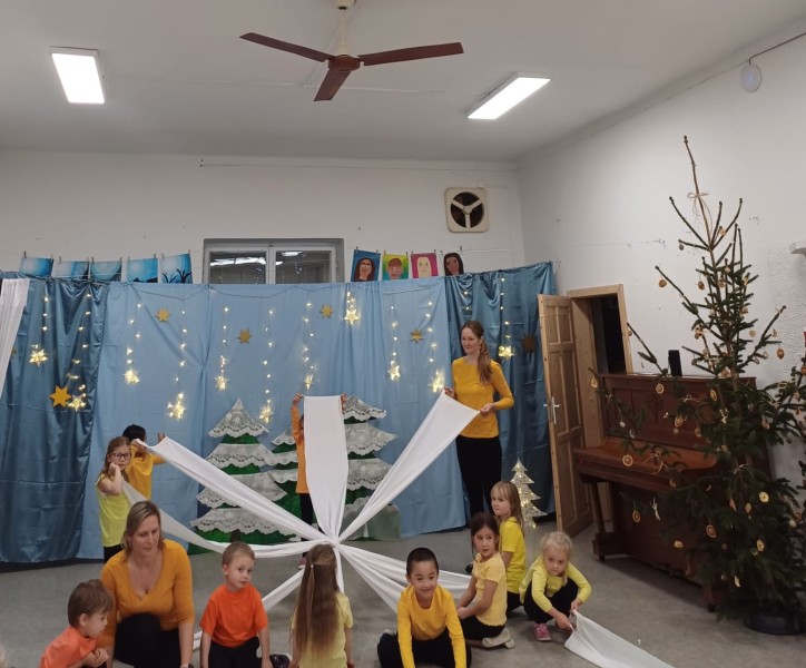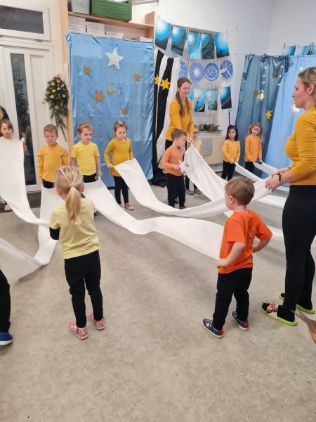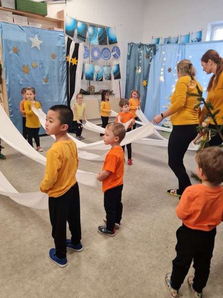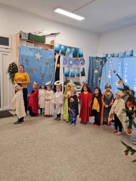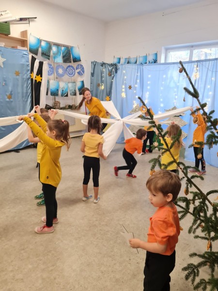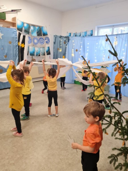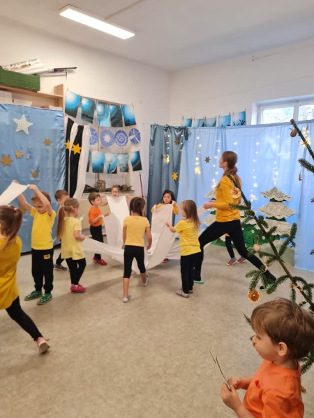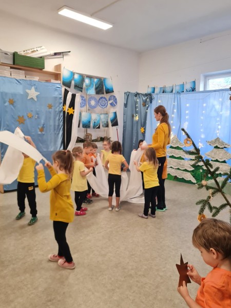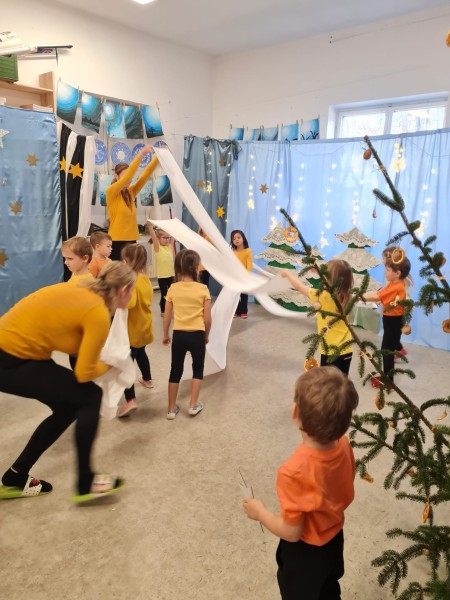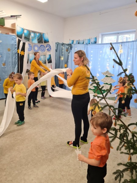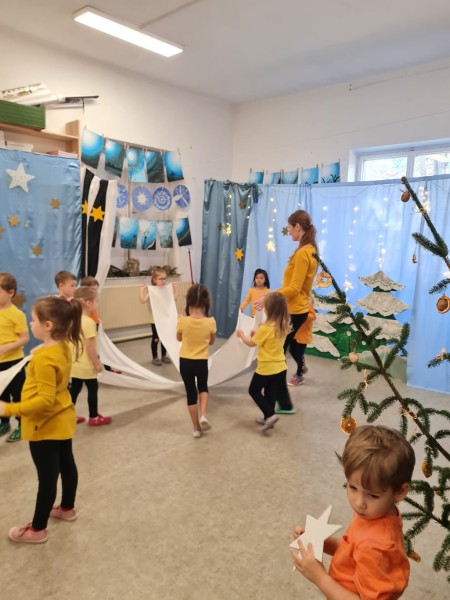 Pro potěšení srdcí našich rodičů, blízkých, známých a následně žáků a učitelů jsme si připravili pásmo vánoční besídky „Vánoční hvězda“, která nás každého provází celý život a díky ní my předáváme potěšení, lásku, radost našim nejbližším, skrz úsměvy, obejmutí, laskavým slovem. Hvězda tak září v každém z nás a doprovází nás jako tři krále, pastýře a osadníky do Betléma. Stínohra předala poselství a pomocí látek jsme pohybem tvořili hvězdy, až jsme se spojili do komety směřující k nebi, s tím poselstvím, že každý má svou cestu a něco následuje. Nakonec jsme s rytmizací a hrou na hudební nástroje zazpívali vánoční píseň, kde se mohli zapojit všichni ostatní, aby s námi mohli prožít krásný čas. Pásmo se dětem velice vydařilo, krásně spolupracovaly, vystupovaly s nadšením a úsměvem na tváři. Ukončeno bylo krásným potleskem, obdivem a pohoštěním s přátelskými slovy. Mockrát děkujeme.